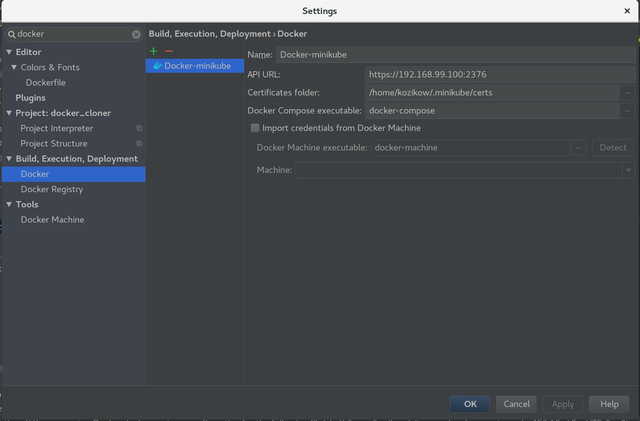 I will write about using docker environment from minikube VM for PyCharm integration.